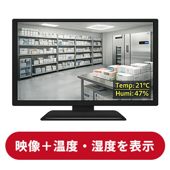 弊社の「温度・湿度モニタリングカメラシステム」は、防犯カメラで撮影したモニター映像上に温度と湿度をリアルタイムで表示できます。