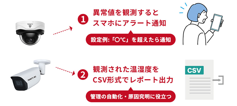 数値データだけでなく映像をセットで残せるため、温度変化の要因が「人の出入り」なのか「設備の故障」なのかなど原因究明にも役立ちます。